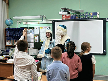 К ученикам младших классов пришли Дед Мороз и Снегурочка, чтобы вручить подарки и поздравить всех с наступающим 2023 годом! Ребята читали стихи, пели песни, а потом стали гостями праздничного представления «Новогодние приключения».