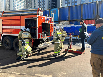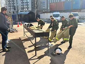 Команда кадетского класса на квалификационном отборе чемпионата профессионального мастерства города Москвы «Московские мастера» в компетенции «Спасательные работы». Команда должна была выполнить 4 здания: надеть боевую одежду пожарного, правильно воспользоваться пожарным рукавом, пройти полосу препятствий в боевой одежде пожарного и спасти человека из колодца.